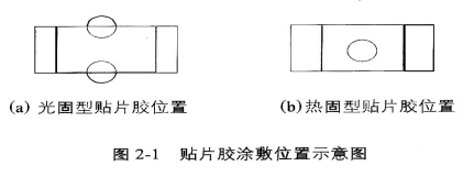(1) 采用光固型貼片膠,元器件下面的貼片膠致少有一半的量處于被照射狀態(tài);采用熱固型貼片膠,貼片膠可完全被元器件覆蓋,見圖2-1;