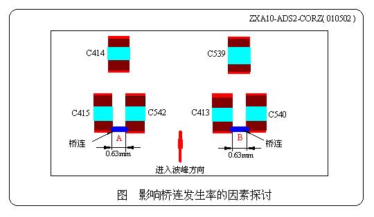 在上講中我們給出了一個討論題:C線在焊接工號為:ZXA10-ADS2-CORZ( 010502 )時,基板上電容C415與C542、C413 與C540之間相鄰間隙均為0.63mm( <1.27mm,屬于設(shè)計不當(dāng)),用新噴嘴開雙波時在圖2所示的A、B二處百分之百地發(fā)生橋連現(xiàn)象,而僅開第二波進行單波焊接時,反而橋連發(fā)生率卻非常小。其實問題就出在助焊劑上,主要原因不外乎是:
