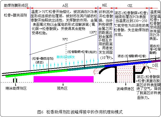 免清洗助焊劑在波峰焊接中的作用機理與模式的描述如圖8所示。