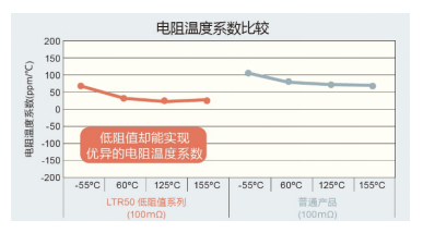 一般情況下,電阻值越低,電阻溫度系數越大,但本系列產品通過優(yōu)化電阻體元件結構,實現了業(yè)界頂級的電阻溫度系數。例如,在100mΩ時LTR50系列實現了±100ppm/℃的電阻溫度系數,可確保使用過程中具有穩(wěn)定的電阻值。