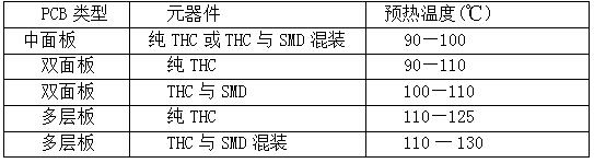 印制板預(yù)熱溫度和時間要根據(jù)印制板的大小、厚度、元器件的大小和多少,以及貼裝元器件的多少來確定。預(yù)熱溫度在90—130℃(PCB表面溫度),多層板及有較多貼裝元器件時預(yù)熱溫度取上限。預(yù)熱時間由傳送帶速度來控制。如預(yù)熱溫度偏低或和預(yù)熱時間過短,焊劑中的溶劑揮發(fā)不充分,焊接時產(chǎn)生氣體引 起氣孔、錫珠等焊接缺陷;如預(yù)熱溫度偏高或預(yù)熱時 間過長,焊劑被提前分解,使焊劑失去活性,同樣會引起毛刺、橋接等焊接缺陷。因此,要恰當(dāng)控制頂熱溫度和時間,最佳的預(yù)熱溫度是在波峰焊前涂覆在PCB底面的焊劑帶有粘性(見表3-1)。