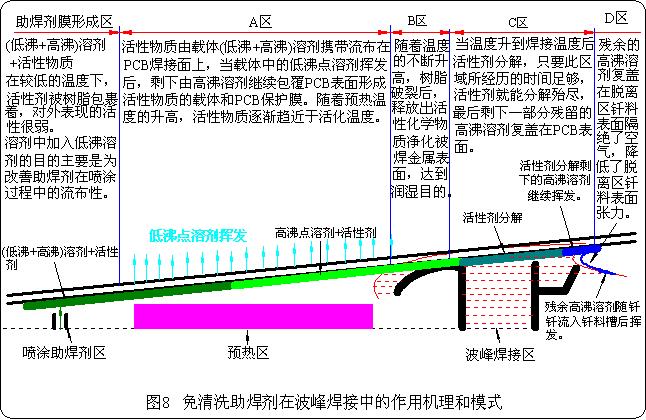 免清洗助焊劑在波峰焊接中的作用機理與模式的描述如圖8所示。